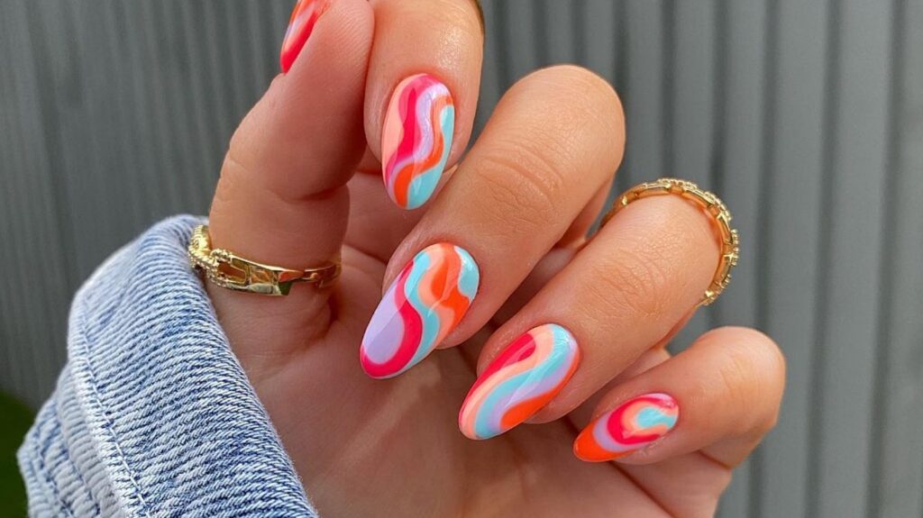A kontrasztos színek – mint a narancs, mustársárga, türkiz és fekete – különlegesen feltűnővé teszik a manikűrt.
